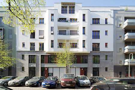 Neubau eines mehrteiligen Wohnungsblocks mit 40 Wohneinheiten in der Dolziger Straße, Berlin-Friedrichshain.