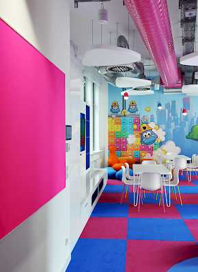 Das Ergebnis sind nach Teams organisierte Großraumbüros mit farbenfrohen Spiel-und Gemeinschaftsflächen, gegliedert durch eingeschobene Glaskuben als Meeting- und Telefonboxen.