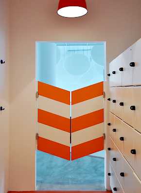 Das Highlight ist der zweigeschossige Loungebereich der über eine mehrfach gewendelte Stahlrutsche mit umlaufender Treppe erschlossen werden kann.