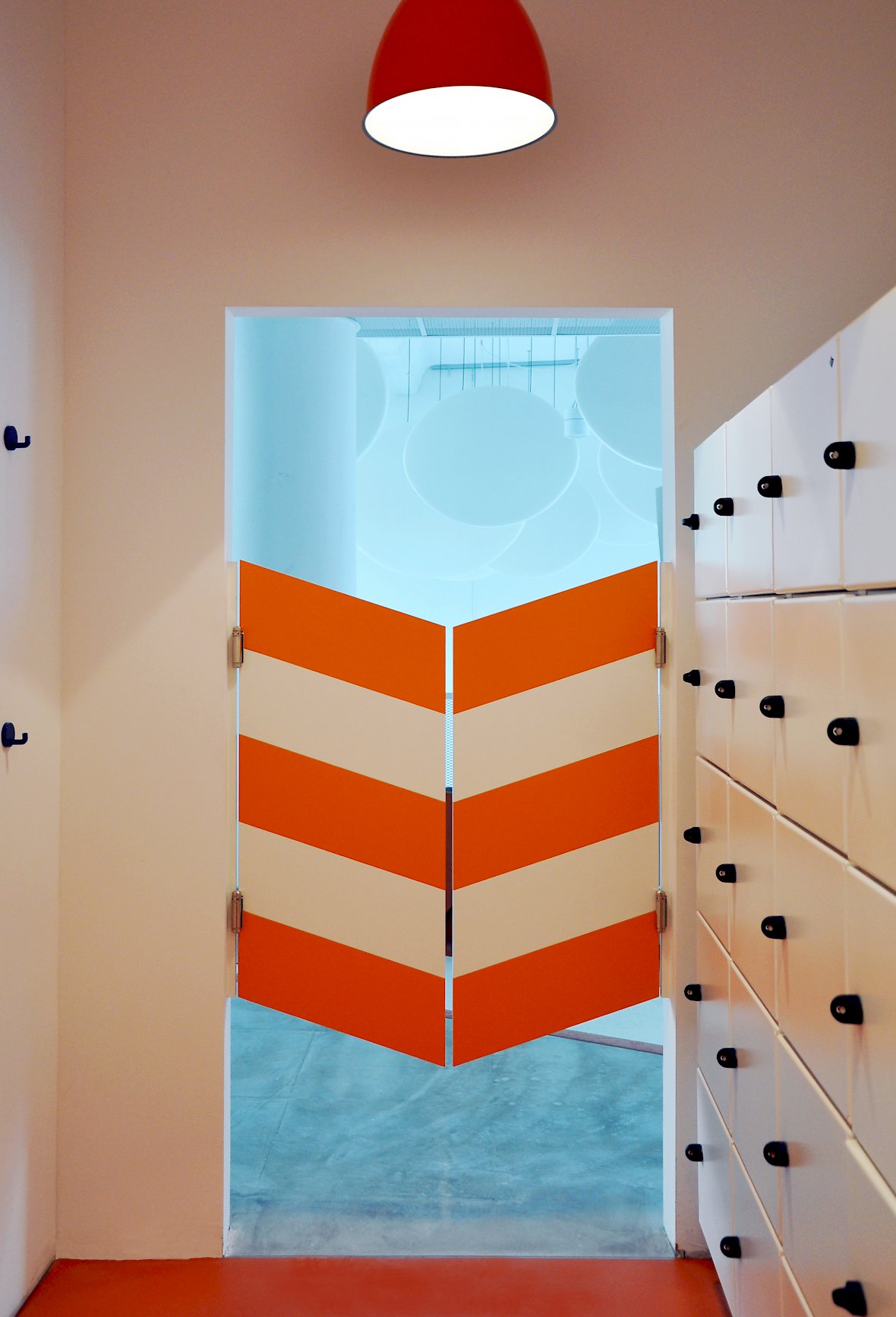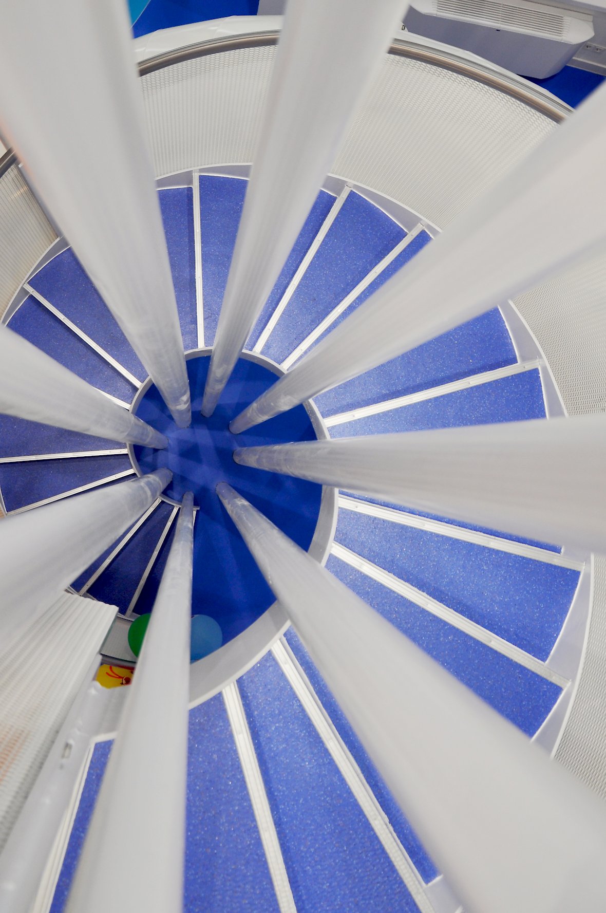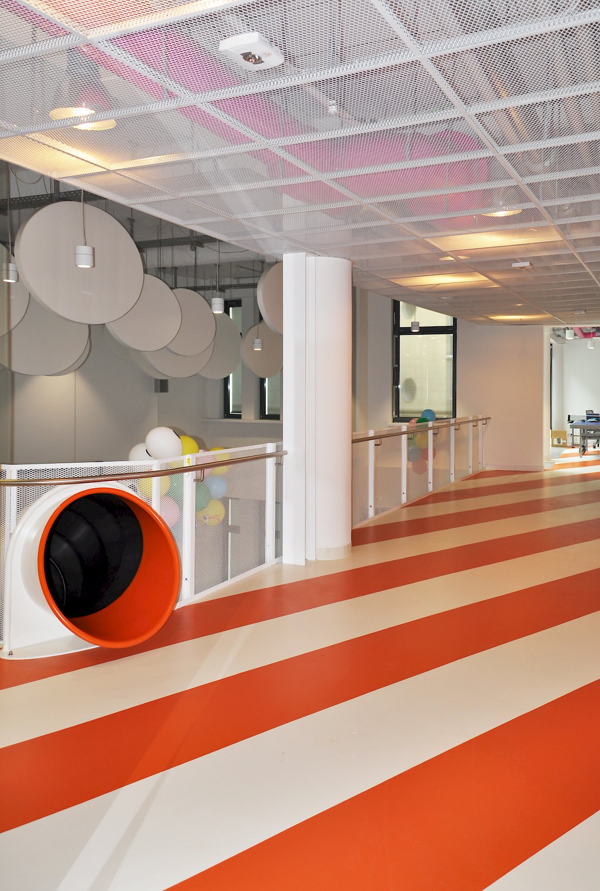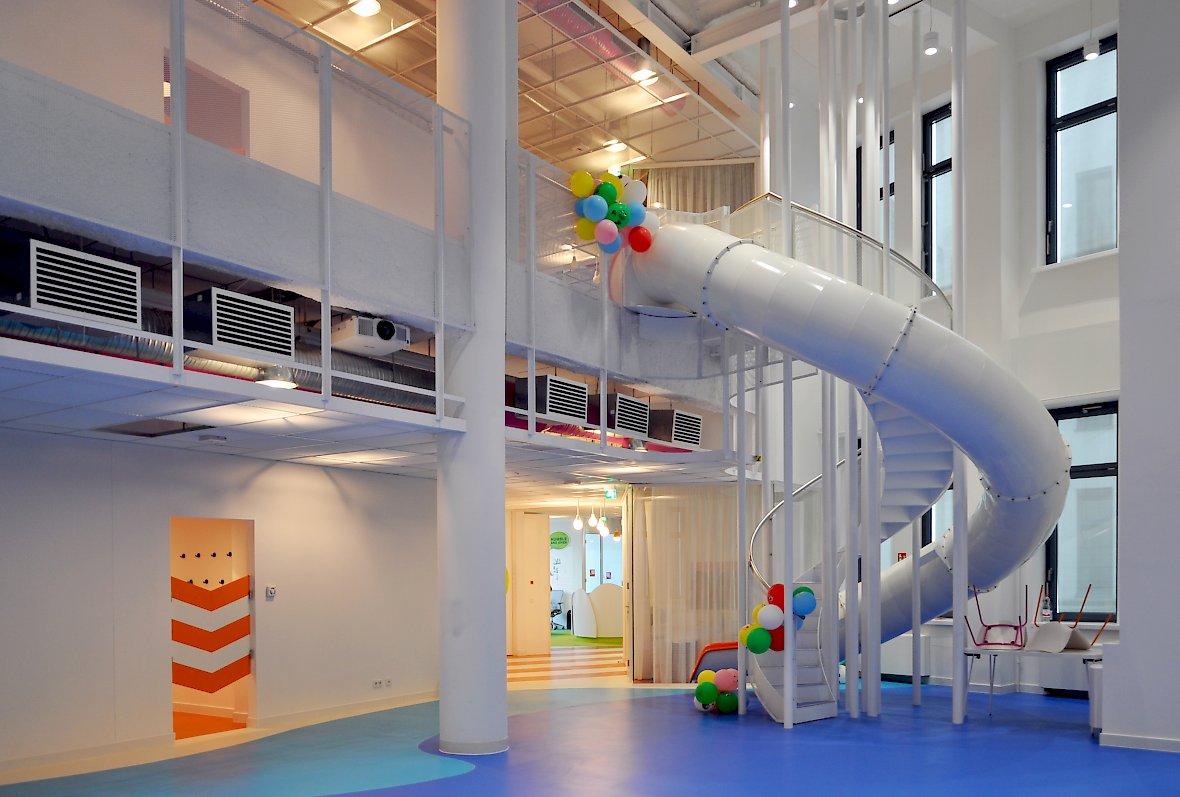 Das Highlight ist der zweigeschossige Loungebereich der über eine mehrfach gewendelte Stahlrutsche mit umlaufender Treppe erschlossen werden kann.