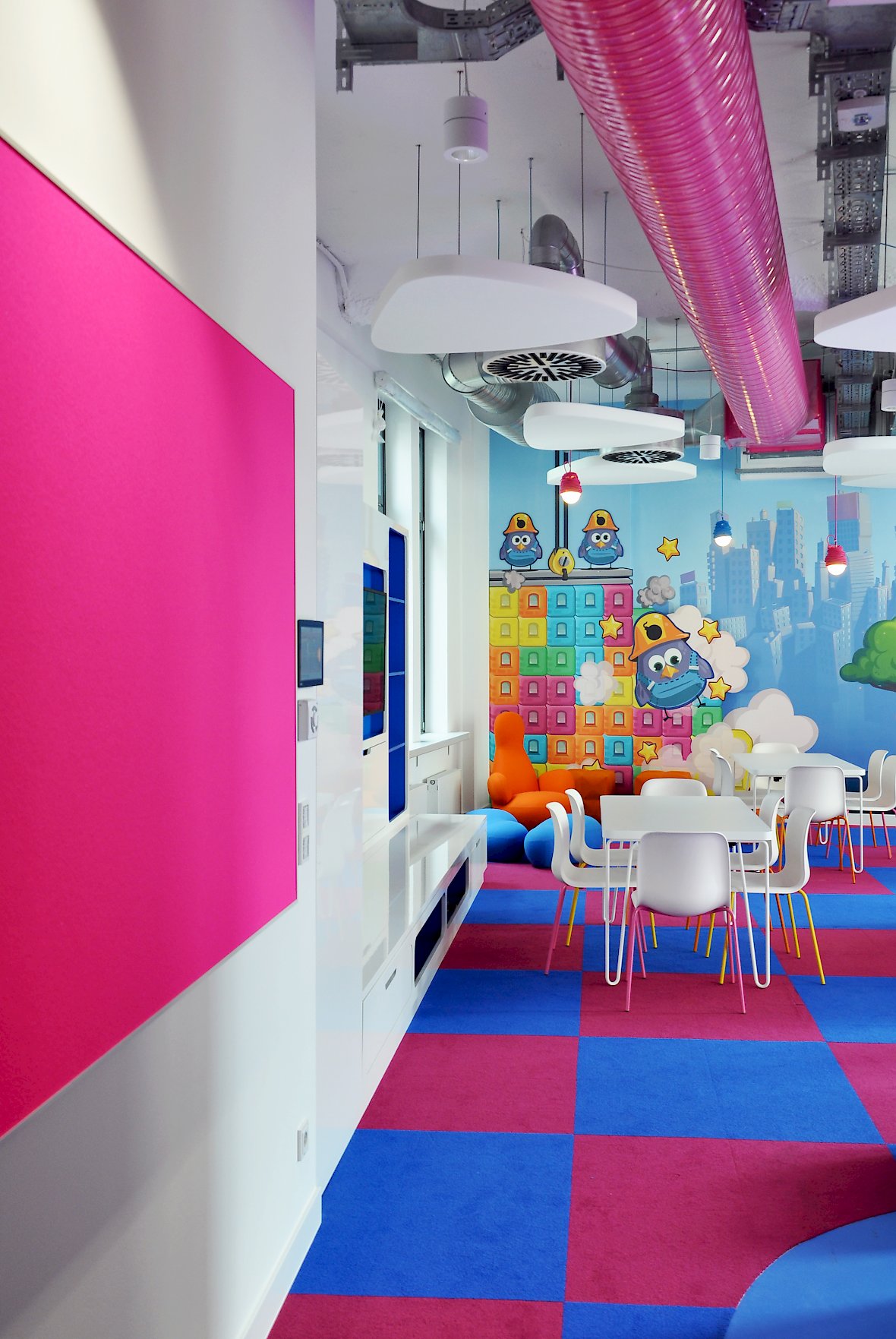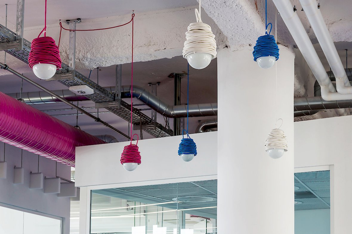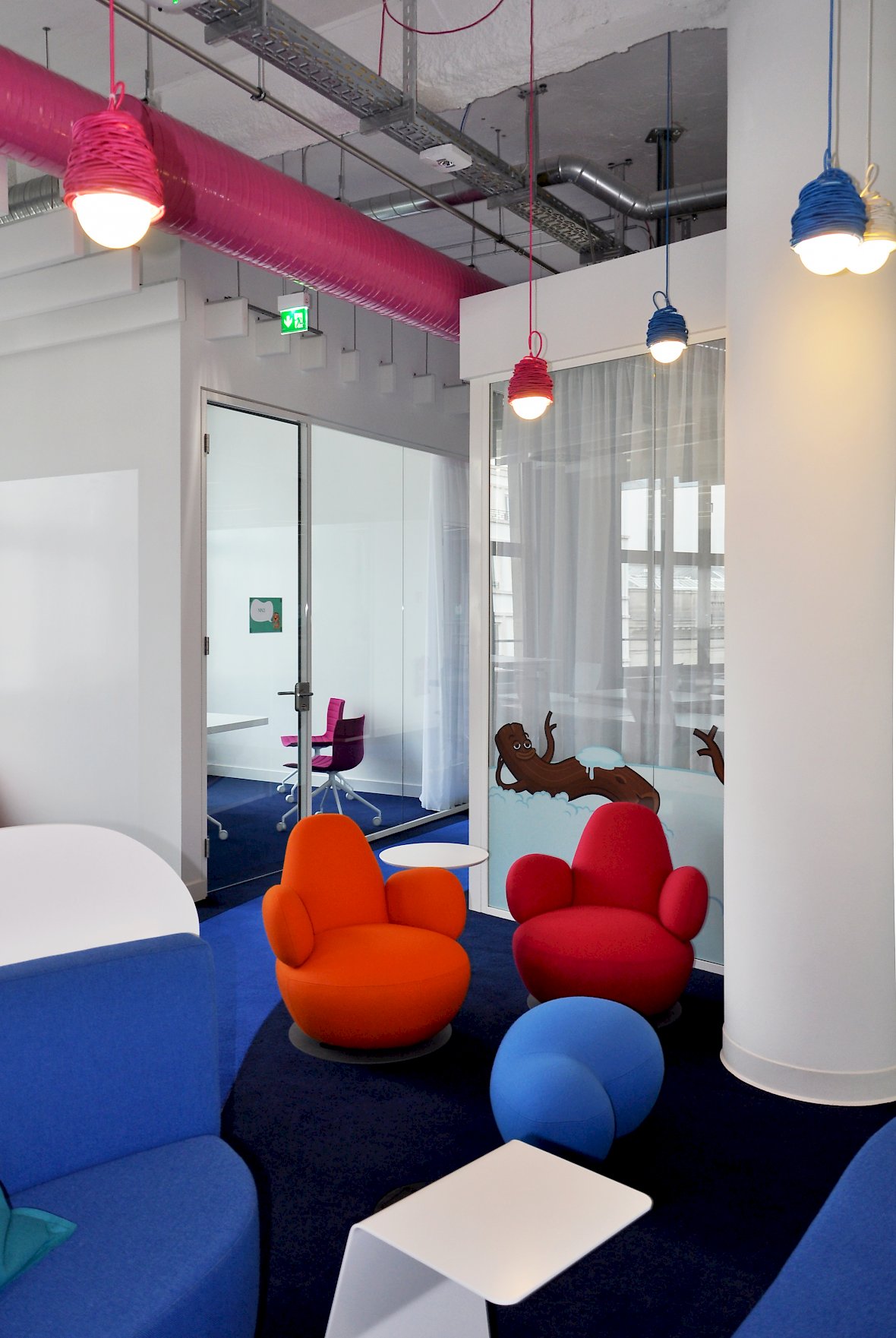 Das Ergebnis sind nach Teams organisierte Großraumbüros mit farbenfrohen Spiel-und Gemeinschaftsflächen, gegliedert durch eingeschobene Glaskuben als Meeting- und Telefonboxen.