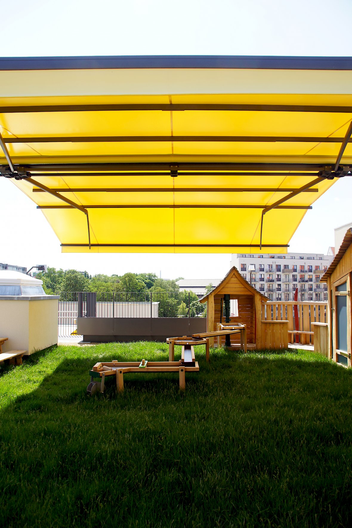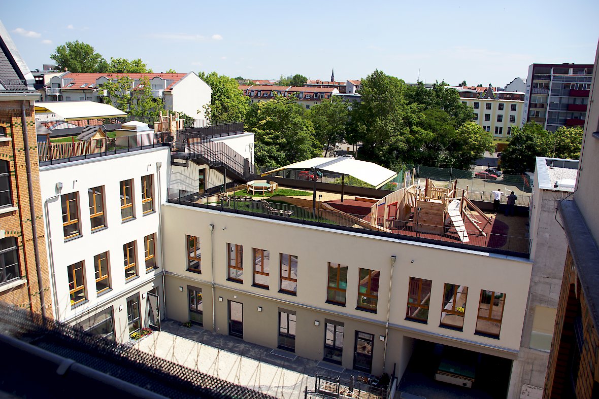 Herzstück der Kita sind die beiden Dachterrassen, die, aus Freiraumtechnischen Gründen erforderlich, aus der normalen Kita eine „städtische“ Kita machen.