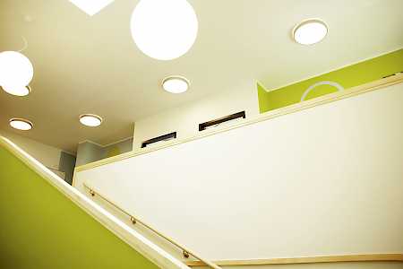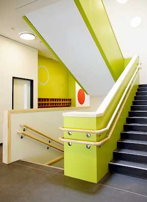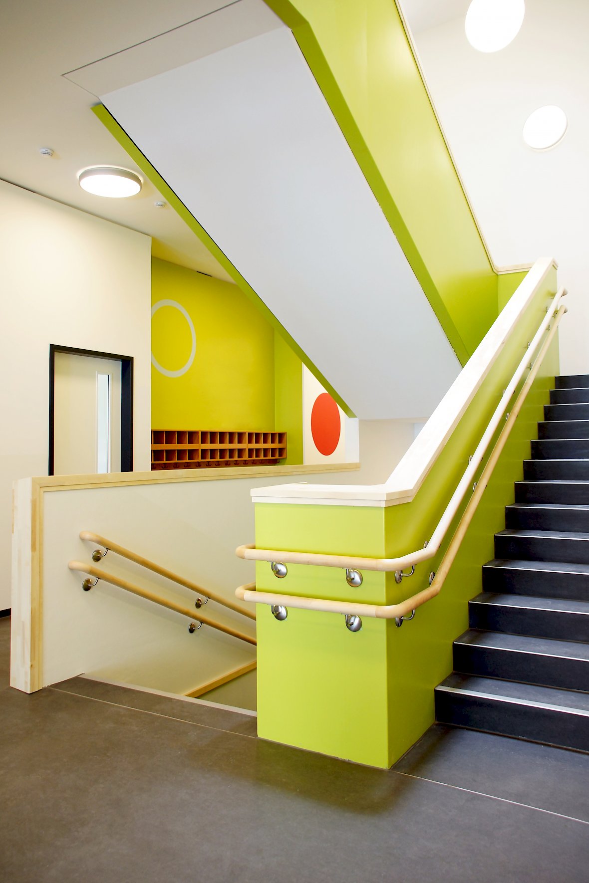 Das Farbkonzept ist angelehnt, entsprechend sportliche Ausrichtung der Kita, an die Olympischen Farben und Ringe, was sich unter anderem auch in den Akustikelementen der Gruppenräume wiederfindet.