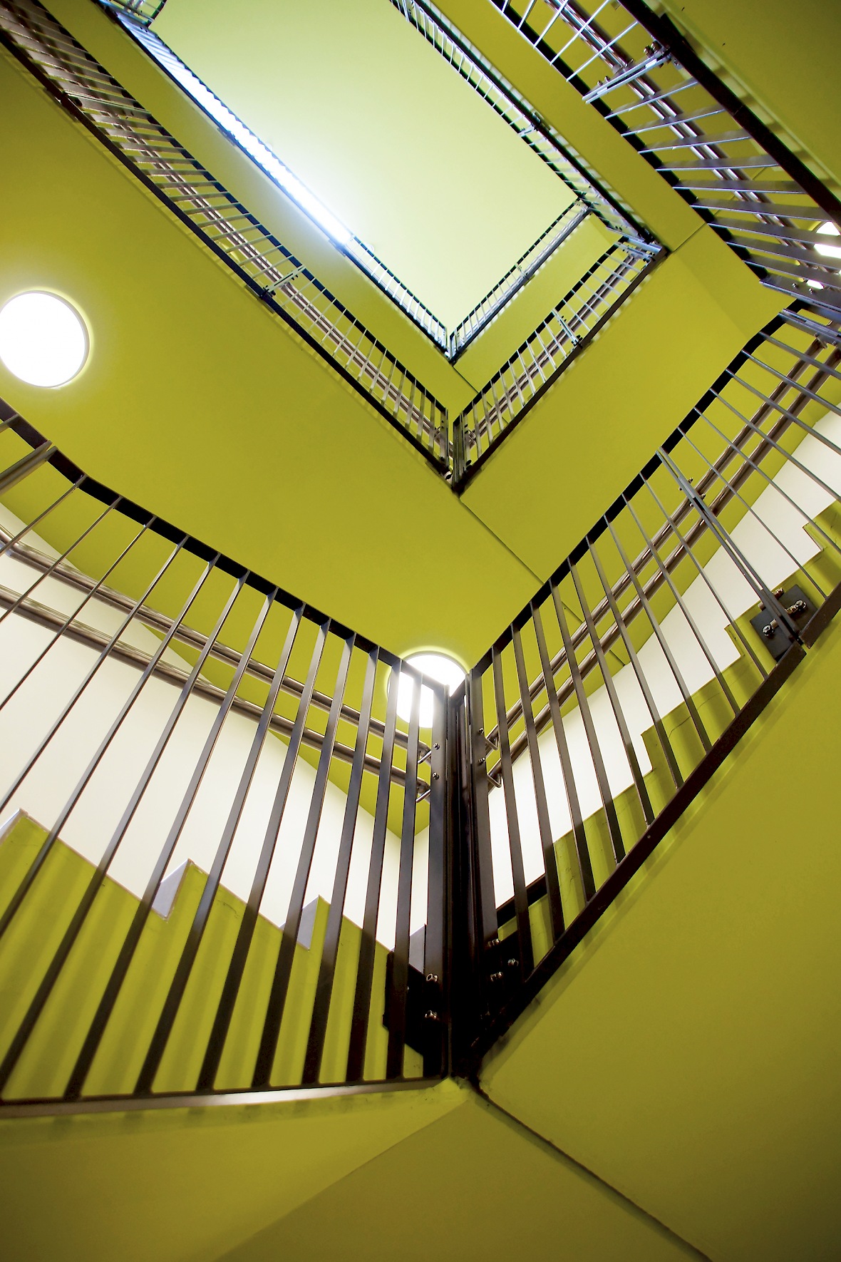 Das Gebäude erstreckt sich über vier Etagen und wird durch ein offenes, repräsentatives Treppenhaus erschlossen.