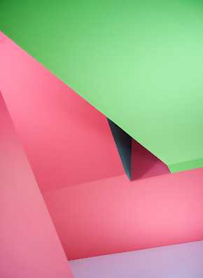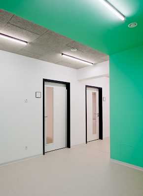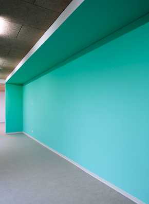 Die etagenweise Aufteilung spiegelt sich im Farbkonzept anhand farblicher Eyecatcher wider. Aus der Flurachse zurückspringende Garderobennischen sowie die Sanitärräume werden in der jeweiligen Etagenfarbe akzentuiert. Die Farbgestaltung der Treppenräume macht den Übergang zwischen den einzelnen Farben durch einen Farbverlauf an den Absturzsicherungen erkenntlich.