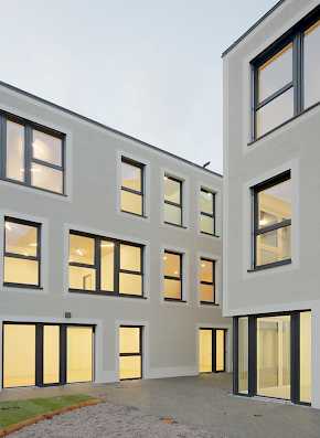Ein Mittelbau markiert die Eingangssituation und verbindet die beiden im 90-Grad-Winkel zueinanderstehenden Gebäudeteile zu der L-Form, die zur Abschirmung des Lärmpegels für die sensiblen Bereiche, wie Schlaf- und Gruppenräume erforderlich war.