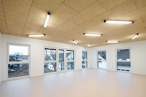 Die Gruppenräume sind farblich bewusst zurückhaltend gestaltet, um die Wände für kreative Basteleien der Kinder freizuhalten. Als spielerisches Element dient die geometrische Anordnung der Beleuchtung, die in den unterschiedlichen Gruppenräumen variiert. Einzelne Leuchtstäbe sind beispielsweise sternförmig oder im Zickzack an der Decke ausgerichtet.
