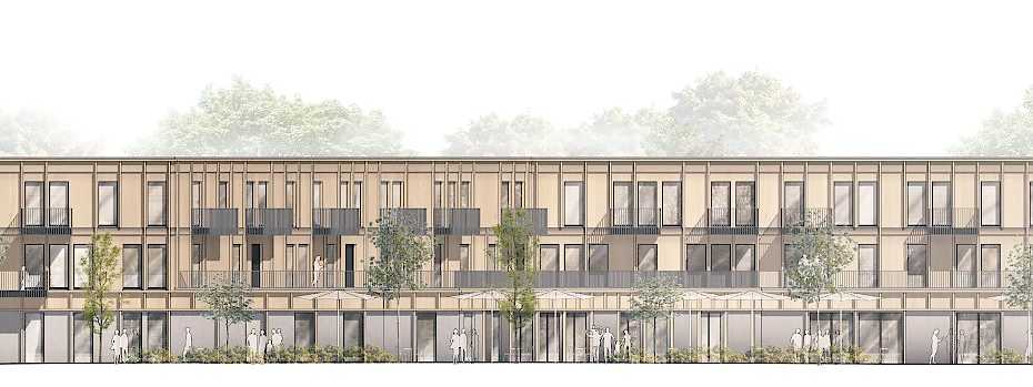 Zum Einsatz kommen Betonfaserplatten, welche das Sockelgeschoss ausbilden sowie eine umlaufende (nachhaltige) Holzverkleidung in den Obergeschossen. Die Zuordnung der Materialien macht die dahinterliegende Nutzung sichtbar und gliedert das Gebäude horizontal.
