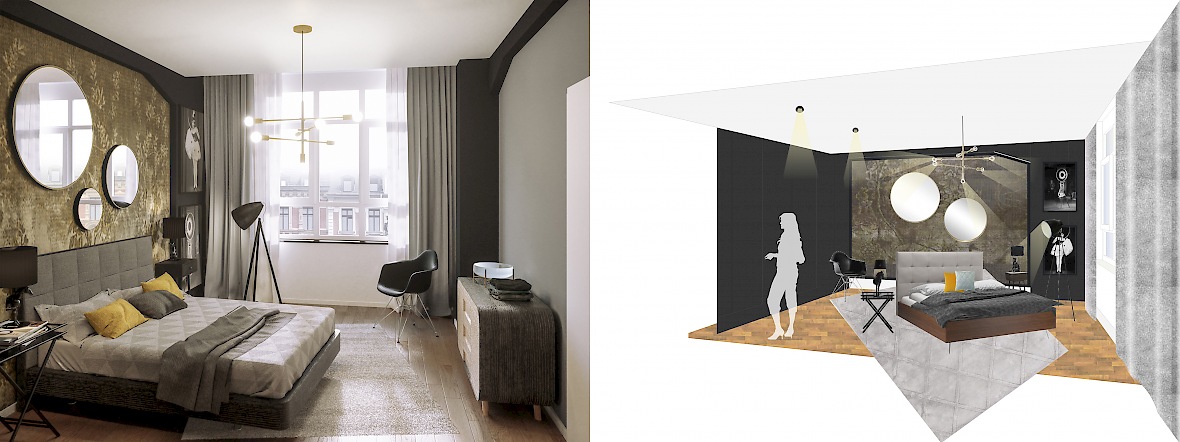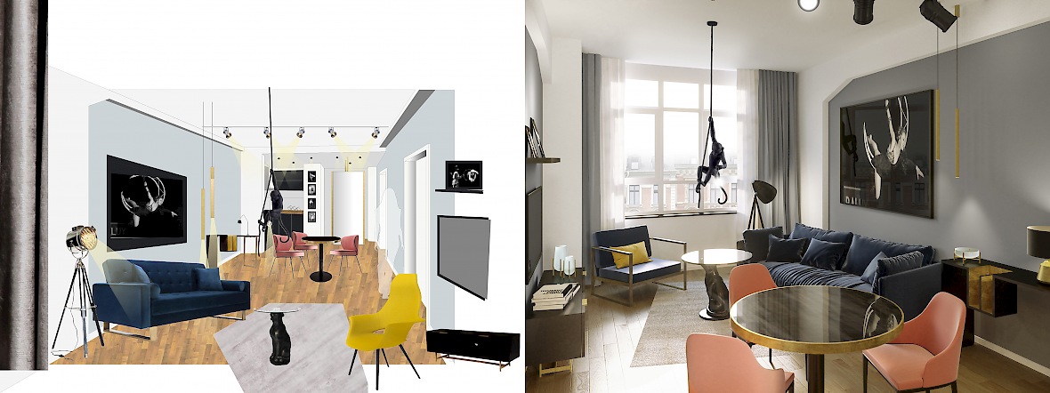 …für ein Konzept, Interiordesign, Geschichte und Architektur in Einklang zu bringen: Die Geschichte des Hauses ehrend und erinnernd wurde in der Innenarchitektur mit Elementen aus Theater und Varieté gearbeitet, die sich in der Verwendung bodenlanger, schwerer Vorhänge, dem Spiel mit Hell-Dunkel-Kontrasten und glänzenden Highlights erkennen lassen. Die Beleuchtung nimmt das Thema Spots auf und interpretiert diese immer wieder neu. Darüber hinaus finden sich dramatische und kuriose Dekorations- und Kunstelemente im ganzen Haus wieder und lassen das Haus somit einerseits gemütlich und wohnlich wie gemütliche Theatersessel wirken, anderseits blitzt der Glamour vergangener Varietézeiten auf.